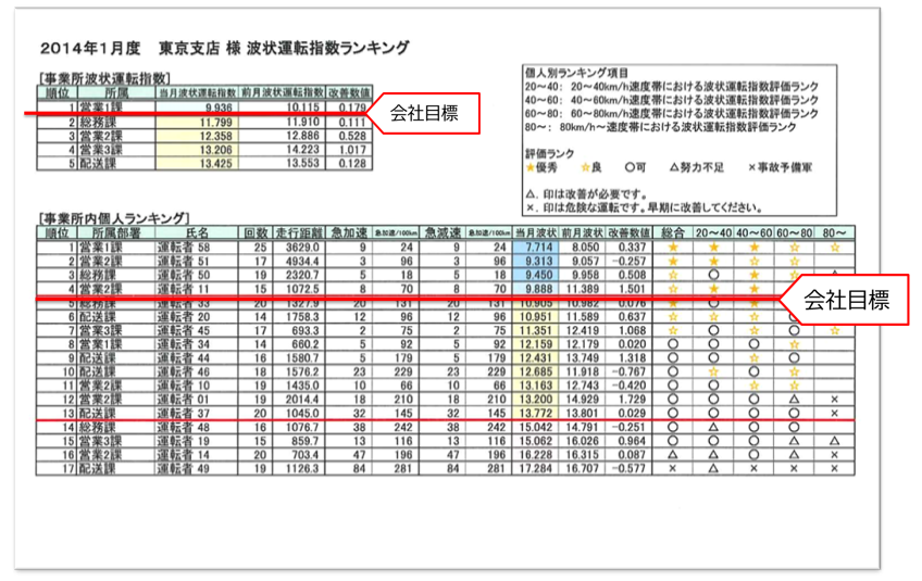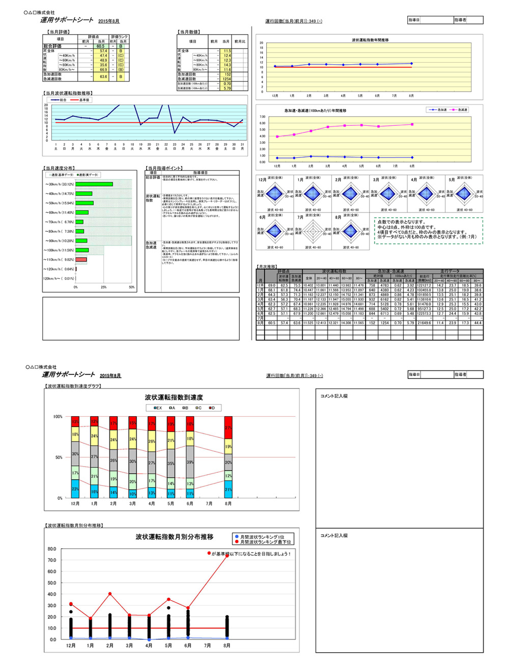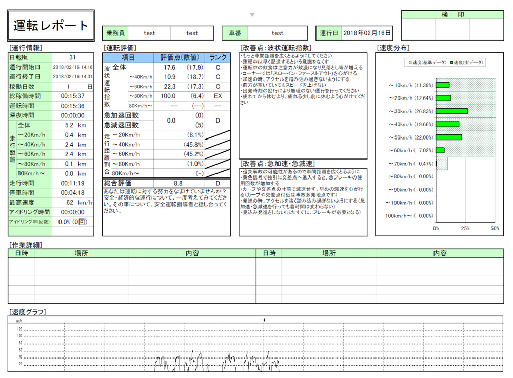 月に1度、お客様の運用データを拝見させて頂き、専用の帳票へメーカーより安全運転指導のコメントをご利用頂いている企業様へメールにてお送り致します!!