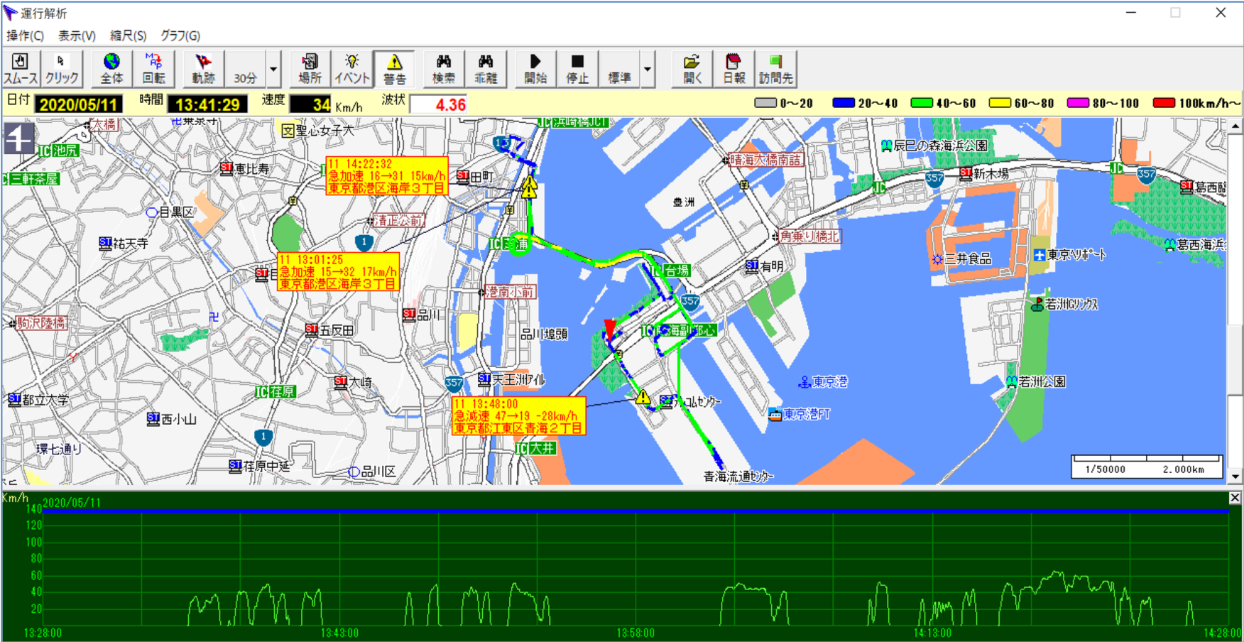 独自の解析方法である「波状運転指数」を用いて、運転状況を可視化するシステム。