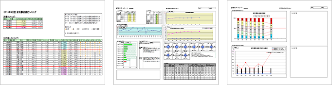 個人の評価がわかる「個人の評価帳票」、事業所の平均的な評価がわかる「事業所の評価帳票」、安全・エコドライブをしている従業員がランキング形式でわかる「ランキング表」など、さまざまな帳票をご用意。3ヶ月毎、半年毎、年間の推移なども把握でき、さまざまな角度から安全運転の実現をサポートします。