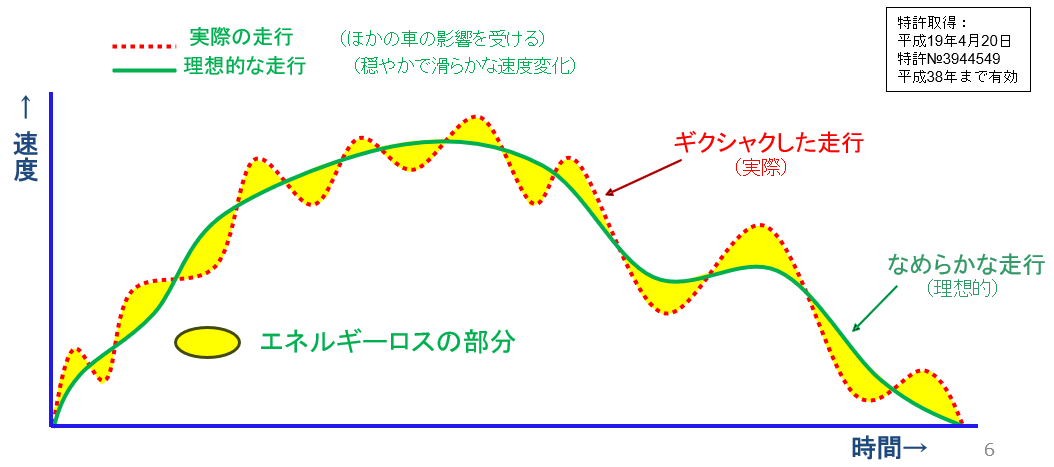 速度や走行軌跡、速度変化などの情報をもとにして「波状運転指数」という指数を算出します。波状運転とは加減速が多いギクシャクした運転です。無駄な加速や減速の頻度が多ければ多いほどエネルギーロスが大きくなり、交通事故が起こる危険性も高くなります。